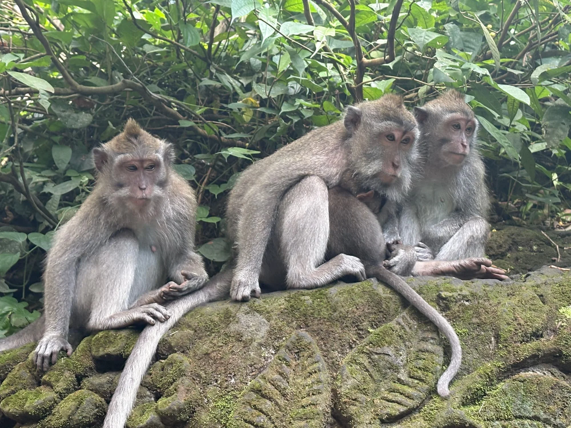 As I wandered slowly, and took my time to explore the stone sculptures covered in green moss, I spotted whole monkey families grooming each other or jumping across vines above my head.